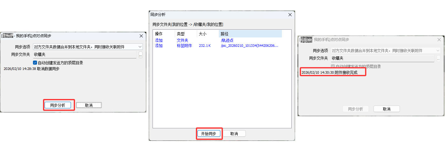 手机端需要设置接收数据的存储位置,点击同步文件夹后面的【>】按钮,设置同步数据存放的位置,设置完成后,点击【确定】→【同步分析】→【开始同步】,等待完成即可。